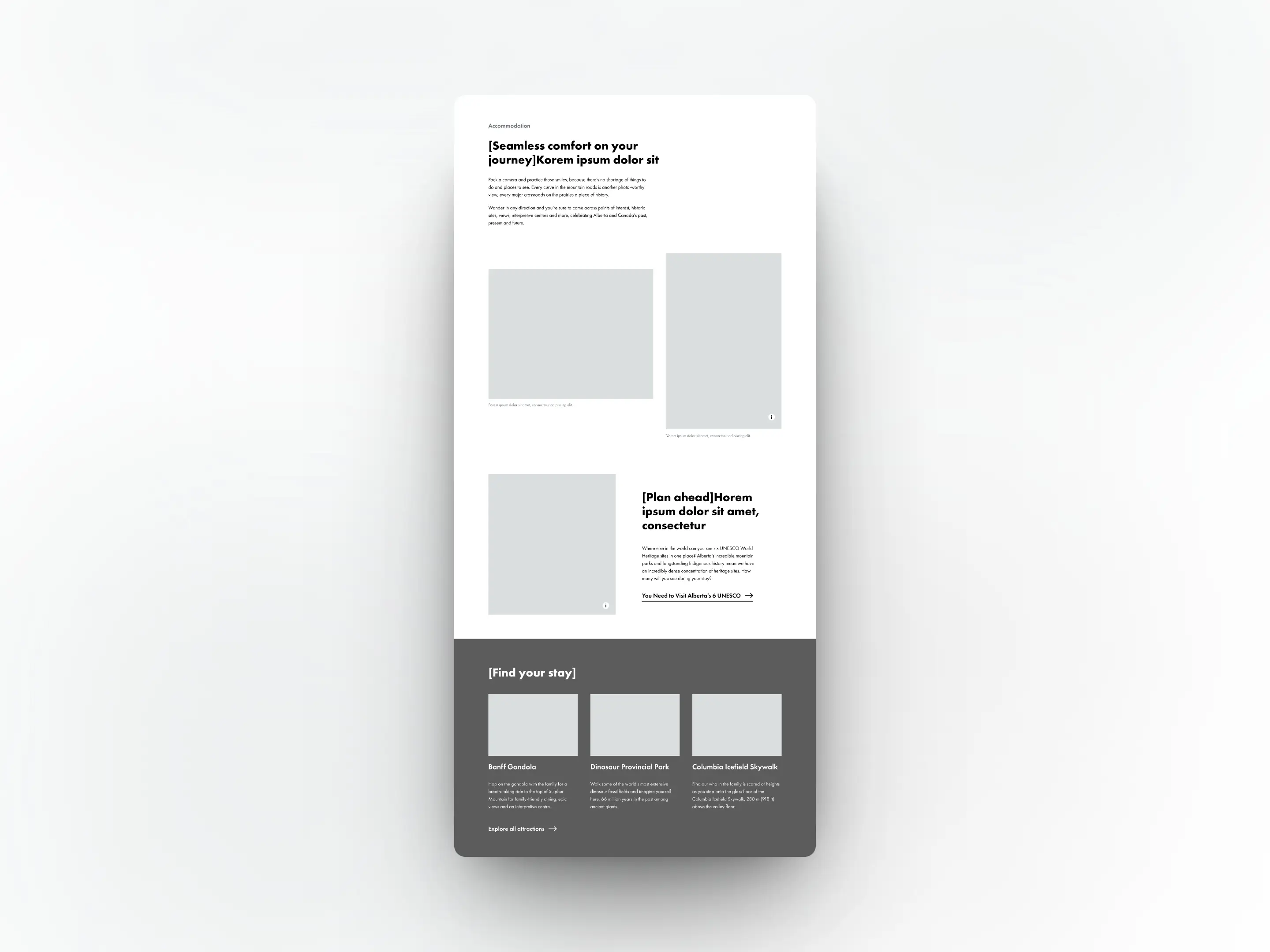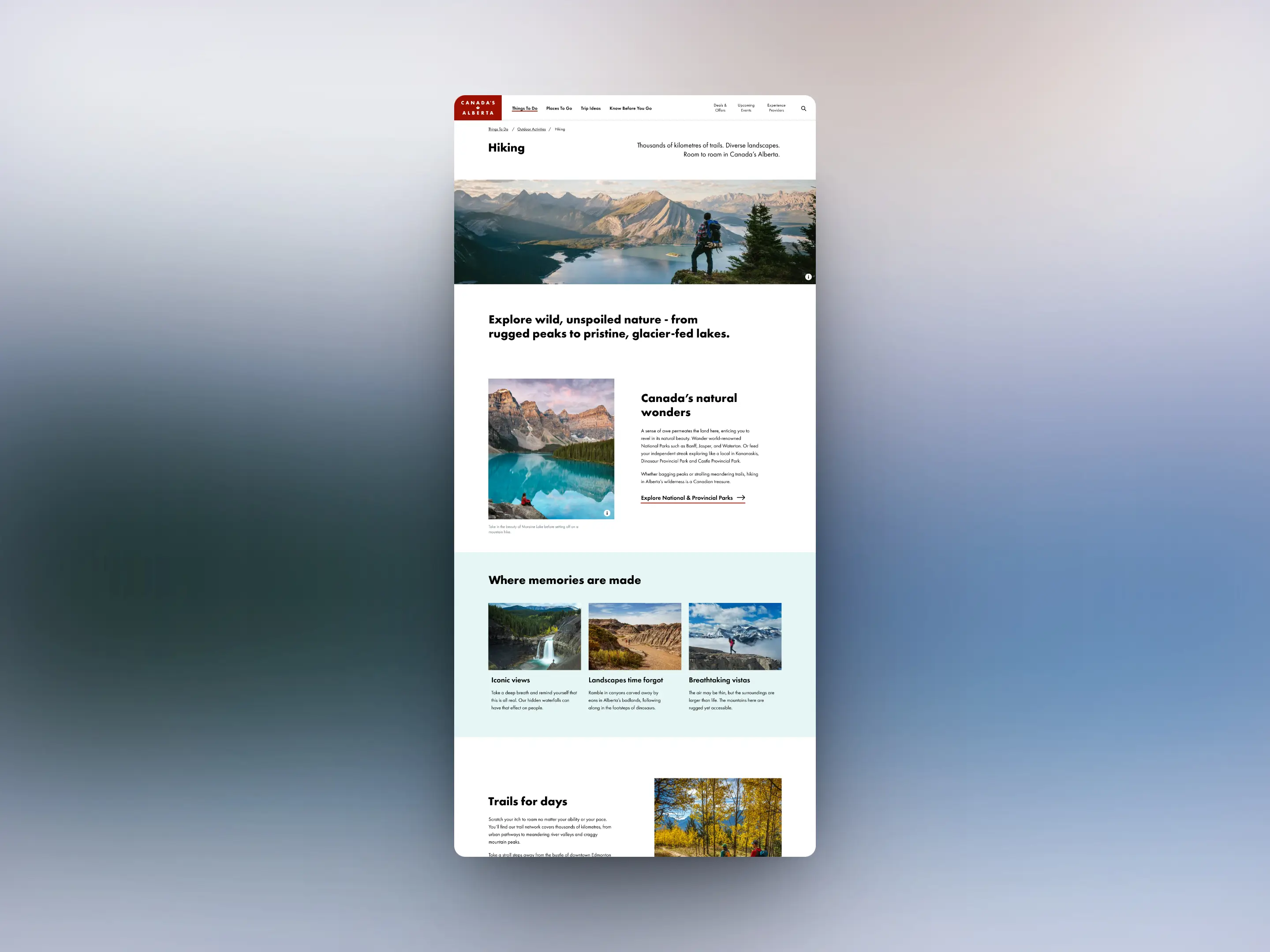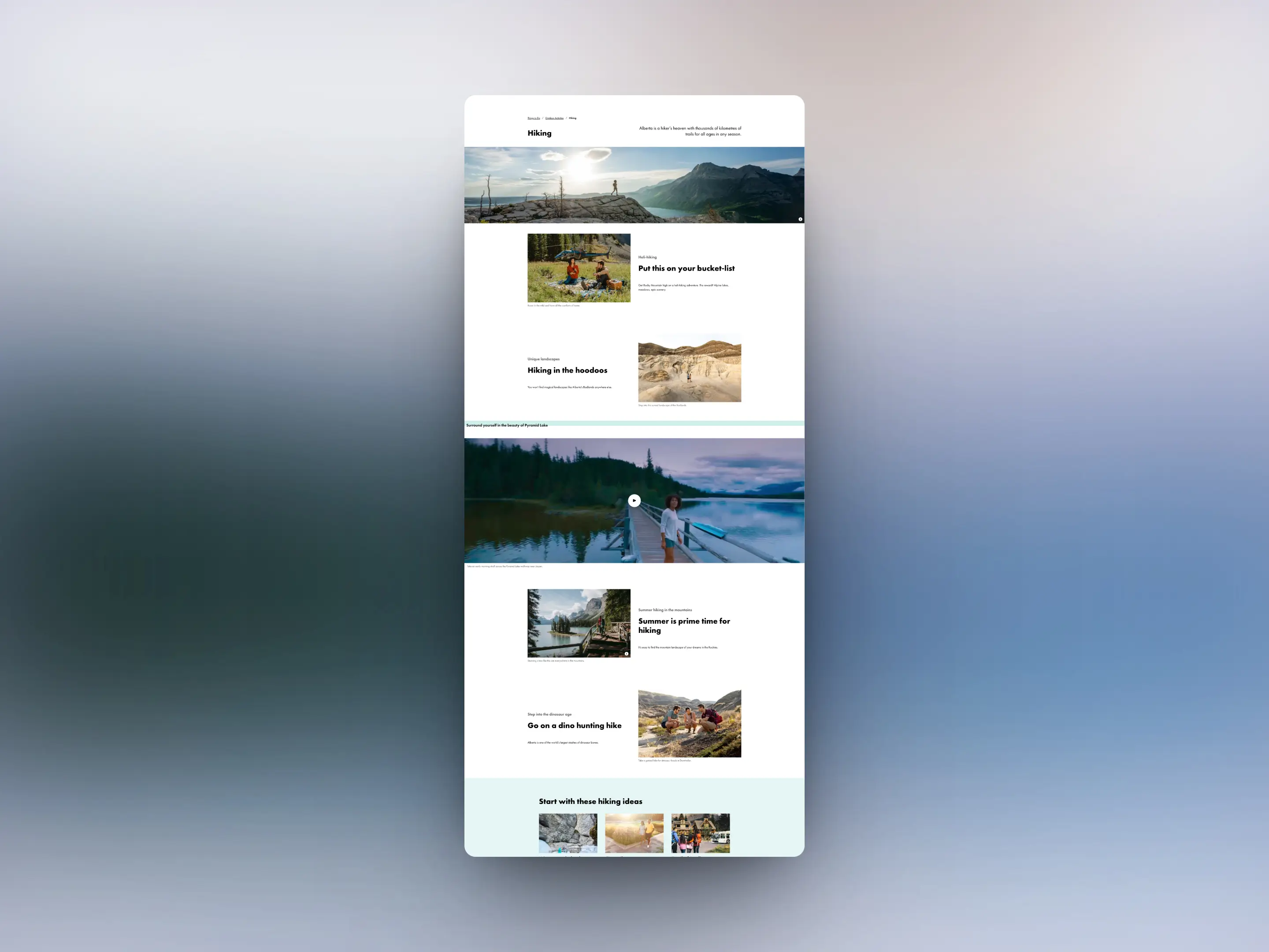 This process involved exploring their current operator library and featuring pertinent content to attract potential future travellers. Utilizing the established pattern library, I outlined a page structure emphasizing storytelling and conveying the essence of why Alberta is a unique destination worth exploring and experiencing.